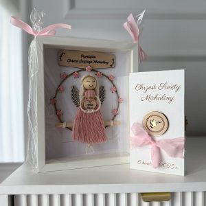 Anioł Stróż z imieniem oraz metryczką (danymi urodzenia dziecka), idealnie wpasuje się w pokoik Waszego dziecka, a także posłuży jako oryginalny prezent.
