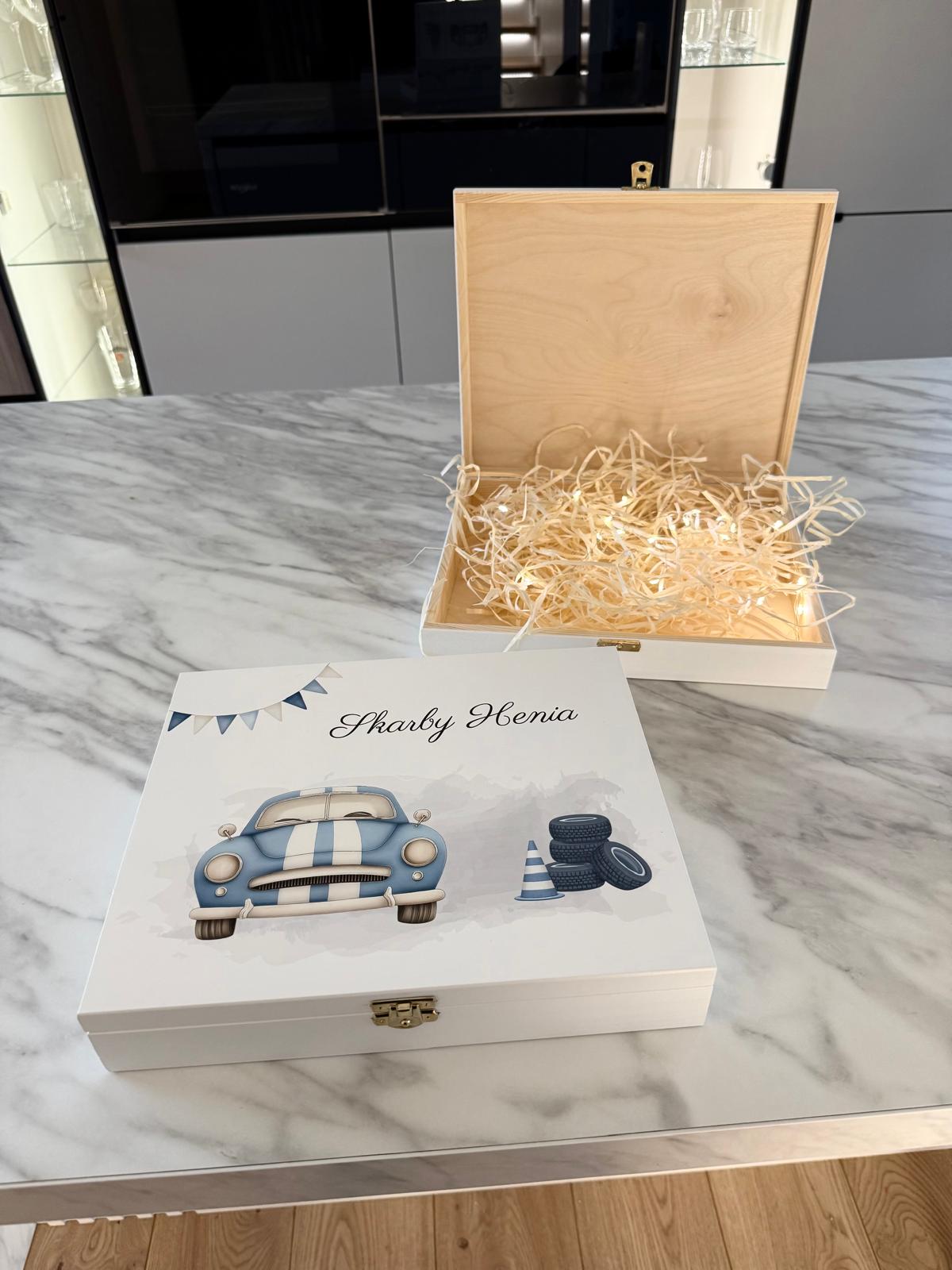 Na wieczku znajduje się urocza grafika błękitnego autka oraz personalizowany napis – np. „Skarby Henia”, dzięki czemu każdy kuferek staje się niepowtarzalny.
