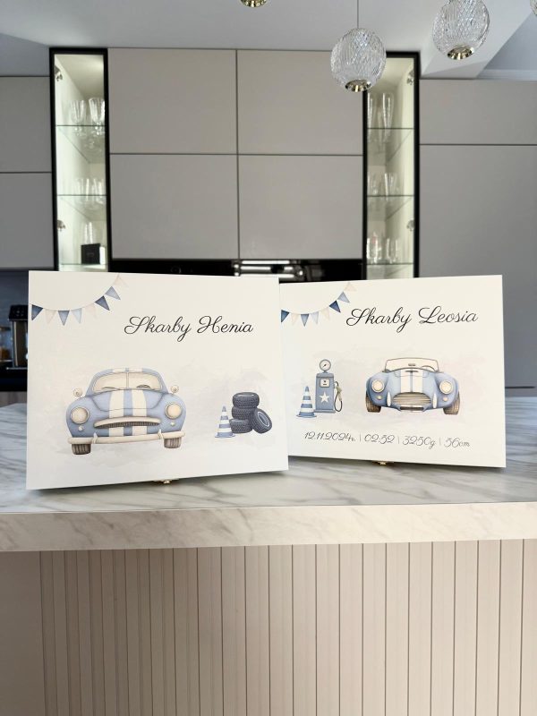 Na wieczku znajduje się urocza grafika błękitnego autka oraz personalizowany napis – np. „Skarby Henia”, dzięki czemu każdy kuferek staje się niepowtarzalny.