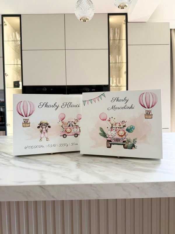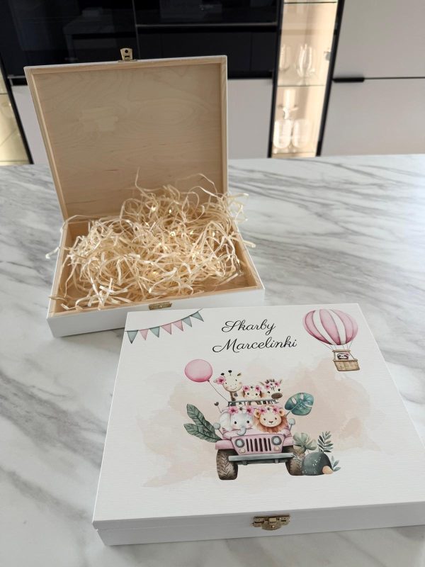Na wieczku znajduje się urocza grafika ze zwierzątkami oraz personalizowany napis – np. „Skarby Marcelinki”, dzięki czemu każdy kuferek staje się niepowtarzalny.
