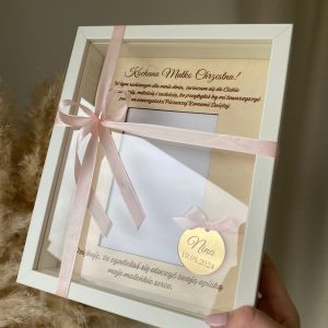 Z tyłu ramki możemy umieścić tabliczkę z życzeniami. Z pewnością prezent stanie się jeszcze bardziej wyjątkowy i osobisty.