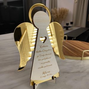 Pamiątka jest w pełni personalizowana, wygrawerujemy na serduszku imię dziecka, które przystępuje do Komunii Świętej, na skrzydełkach widnieje napis „Na pamiątkę I Komunii Świętej”
