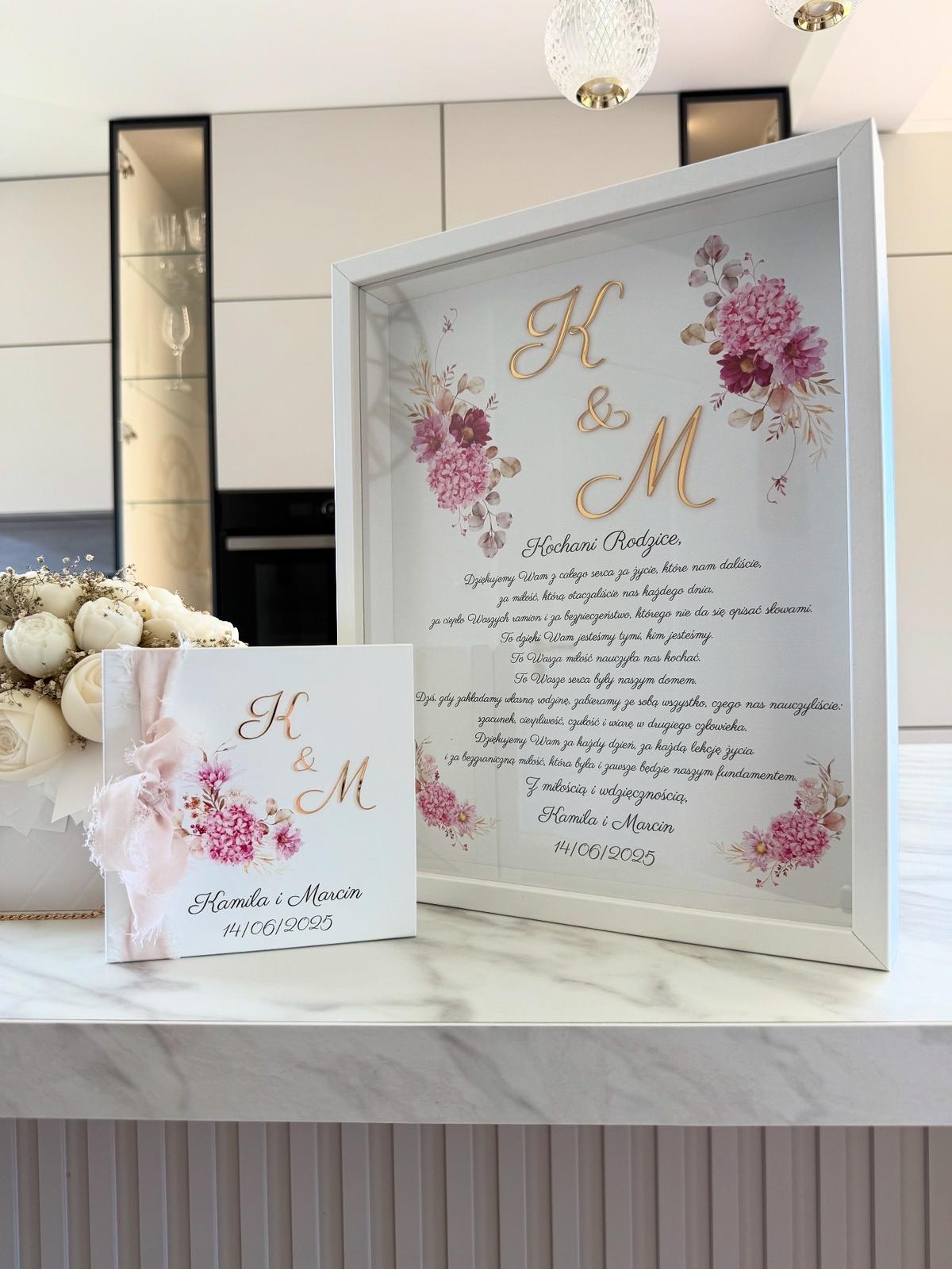 •Ramka z podziękowaniem – subtelny, pełen emocji tekst dedykowany Rodzicom, ozdobiony eleganckimi inicjałami oraz kwiatową grafiką w odcieniach pudrowego różu i złota. Całość zamknięta w białej ramie, gotowa do postawienia lub zawieszenia.