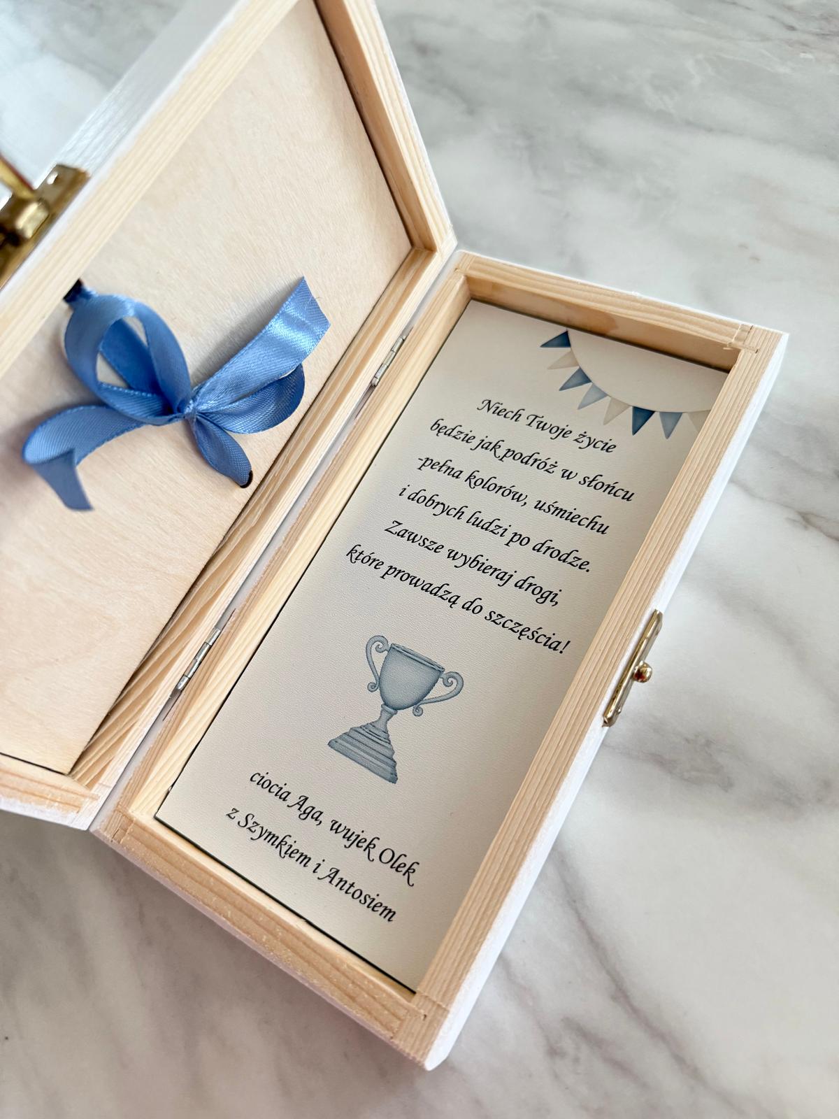✨ Drewniane pudełko z wierszykiem i dedykacją – ozdobione wstążką i grafiką dopasowaną do ramki
