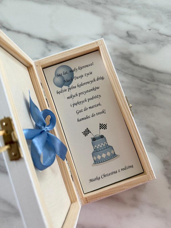 ✨ Drewniane pudełko z wierszykiem i dedykacją – ozdobione wstążką i grafiką dopasowaną do ramki